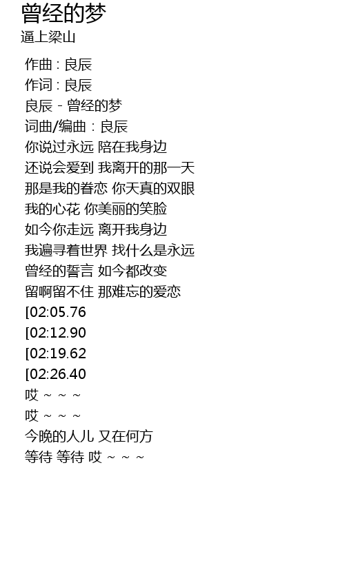 | [00:02.32] | 良辰 - 曾经的梦 |