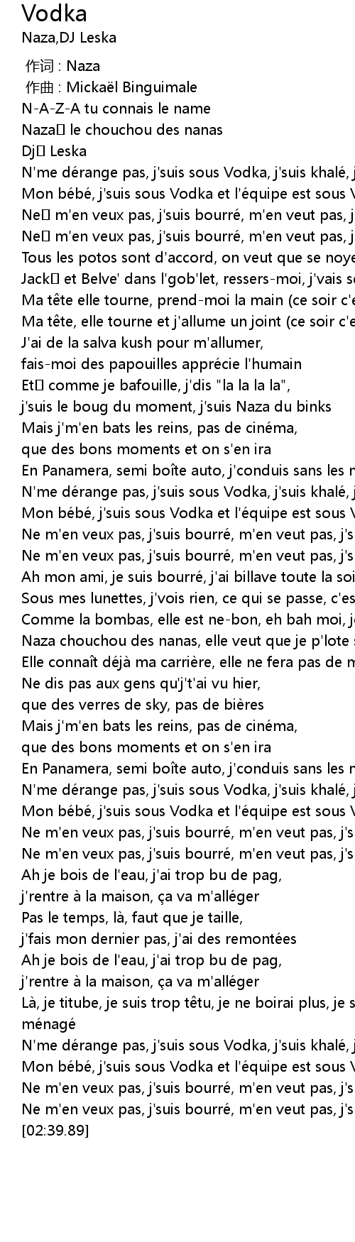 | [02:27.71] | Mon bébé, j'suis sous Vodka et l'équipe est sous Vodka |
