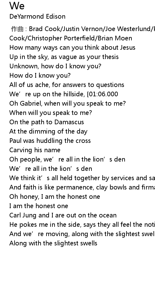 | [00:00.000] | zuò qǔ : Brad Cook Justin Vernon Joe Westerlund Phil Cook Christopher Porterfield Brian Moen |