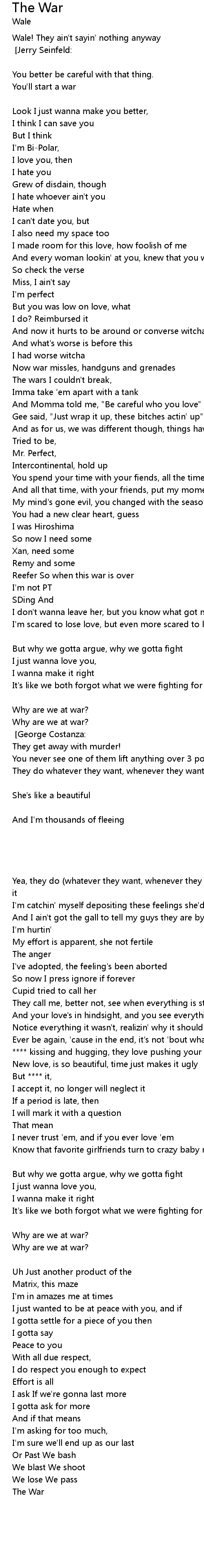 So baby why are we at war? [Wale - outro] |