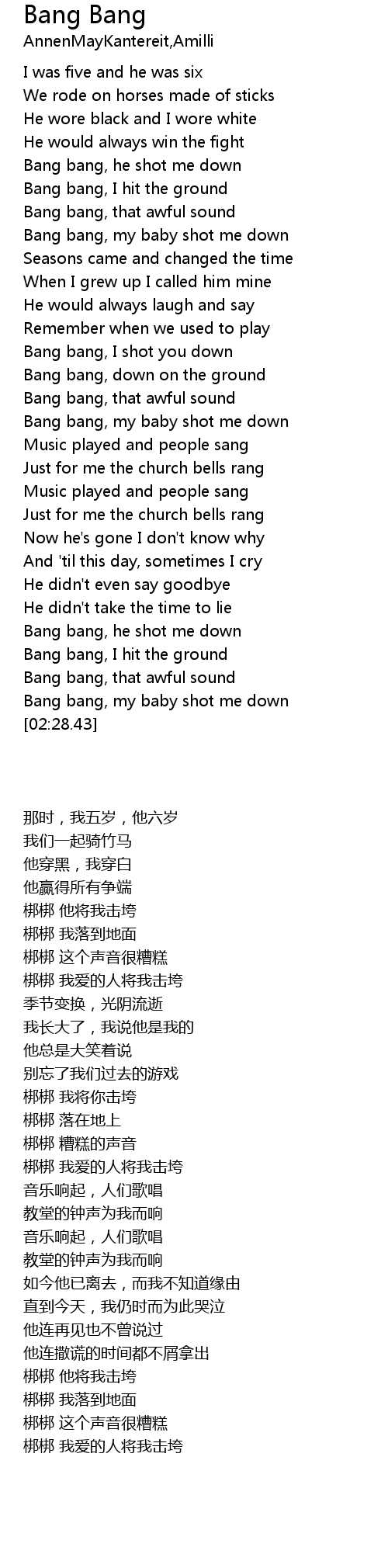| [02:17.00] | Bang bang, that awful sound |
