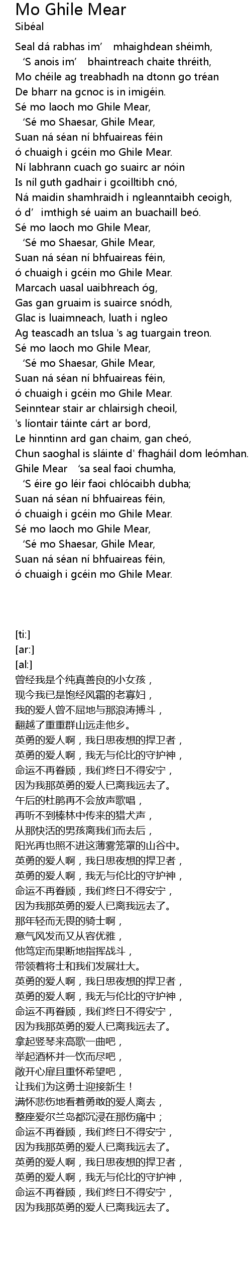 | [00:34.20] | Sé mo laoch mo Ghile Mear, |