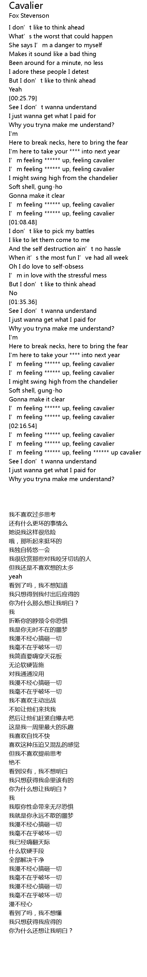 | [00:51.34] | I' m feeling up, feeling cavalier |