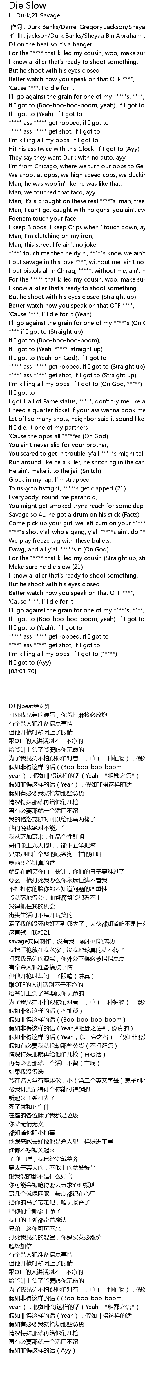 | [01:22.92] | For the that killed my cousin, woo, make sure he die slow |