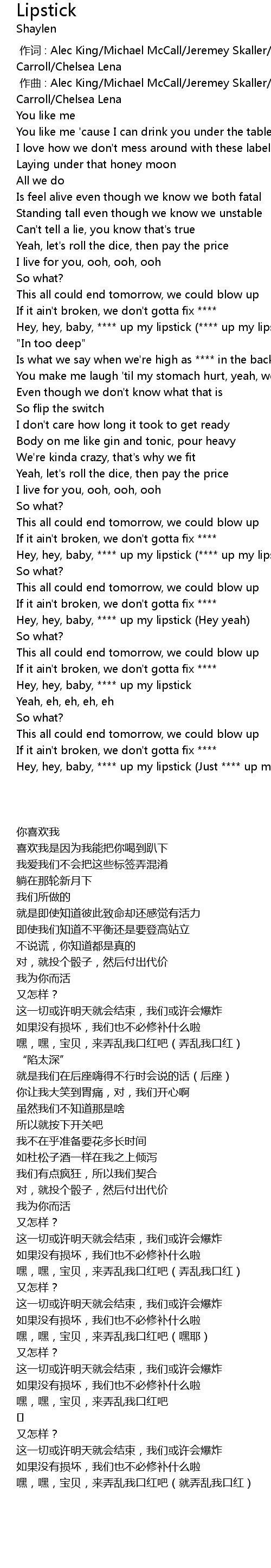| [00:00.39] | 作曲 : Alec King/Michael McCall/Jeremey Skaller/Pat McManus/Shaylen Carroll/Chelsea Lena |