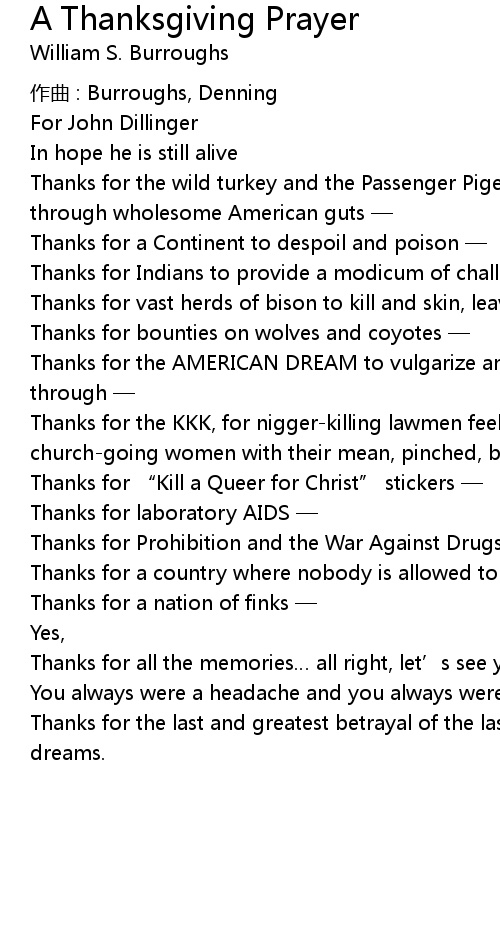 | Thanks for the wild turkey and the Passenger Pigeons, destined to be shit out through wholesome American guts — | |