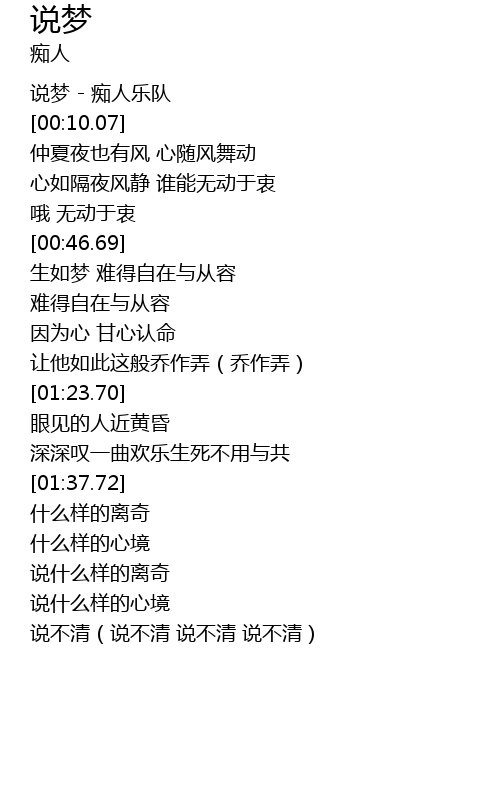 | [00:01.33] | 说梦 - 痴人乐队 |
