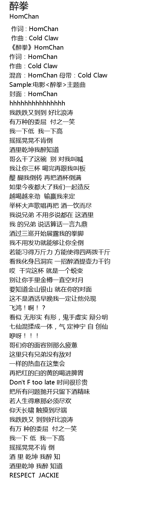 | [00:10.15] | Sample:电影<醉拳>主题曲 |