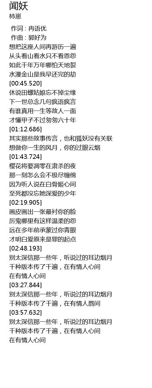 | [01:20.792] | 其实那些故事传言,也和狐妖没有关联 |