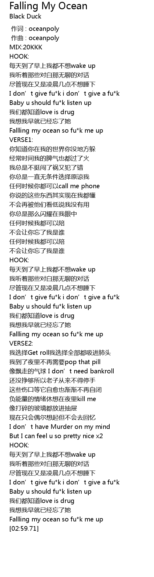 | [02:54.64] | Fallling my ocean so fu*k me up |