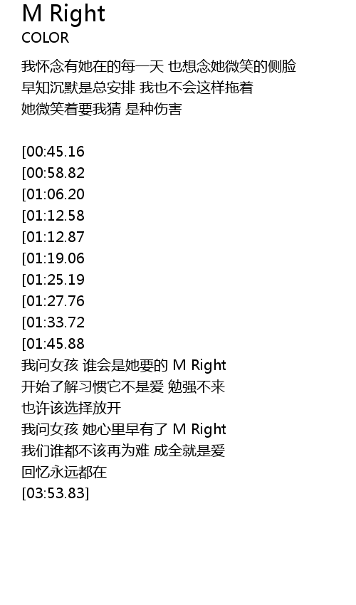 | [02:30.45][01:12.87] | 我问女孩 谁会是她要的 M Right |