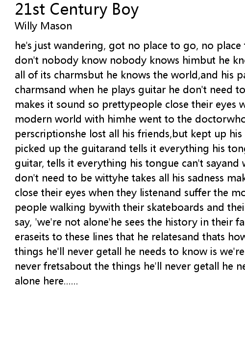 he's just wandering, got no place to go, no place to gohe's just wandering, don't nobody know nobody knows himbut he knows the world,and his paintings show all of its charmsbut he knows the world,and his paintings show all of its charmsand when he plays guitar he don't need to be wittyhe takes all his sadness makes it sound so prettypeople close their eyes when they listenand suffer the modern world with himhe went to the doctorwho gave him perscriptions, gave him perscriptionshe lost all his friends,but kept up his rhythm, kept his rhythmhe picked up the guitarand tells it everything his tongue can't saypicked up the guitar, tells it everything his tongue can't sayand when he plays guitar he don't need to be wittyhe takes all his sadness makes it sound so prettypeople close their eyes when they listenand suffer the modern world with himhe sees the people walking bywith their skateboards and their eyesand their clothes that say, 'we're not alone'he sees the history in their facehistory that they can't eraseits to these lines that he relatesand thats how he never fretsabout the things he'll never getall he needs to know is we're not aloneand thats how he never fretsabout the things he'll never getall he needs to know iswe're not alone here...... |