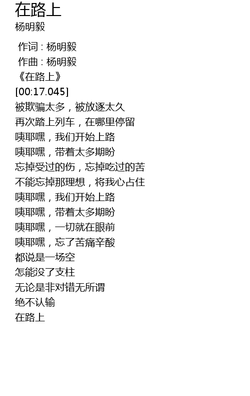 | [00:32.294] | yí yé hēi, wǒ men kāi shǐ shàng lù |