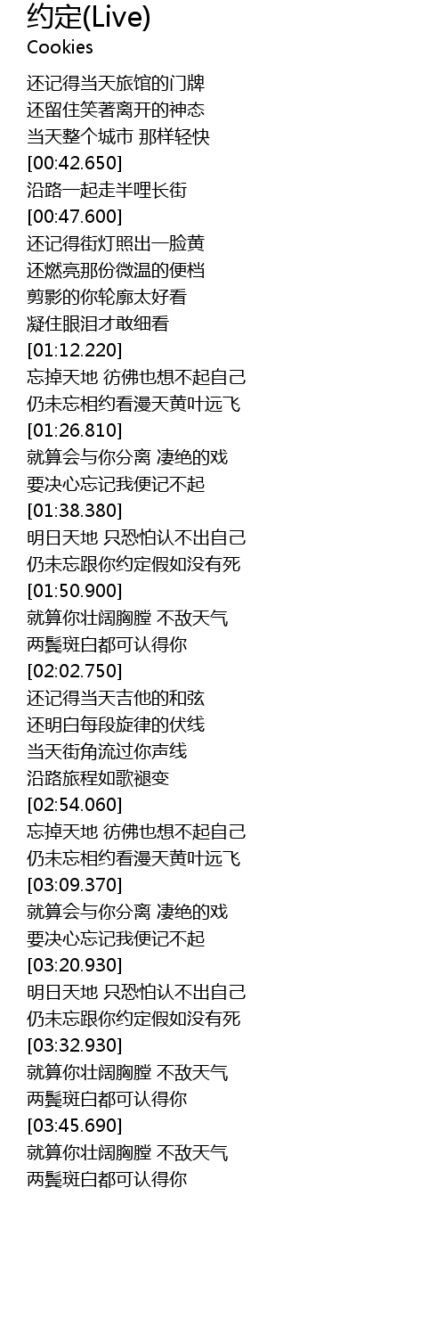 | [01:45.730] | réng wèi wàng gēn nǐ yuē dìng jiǎ rú méi yǒu sǐ |