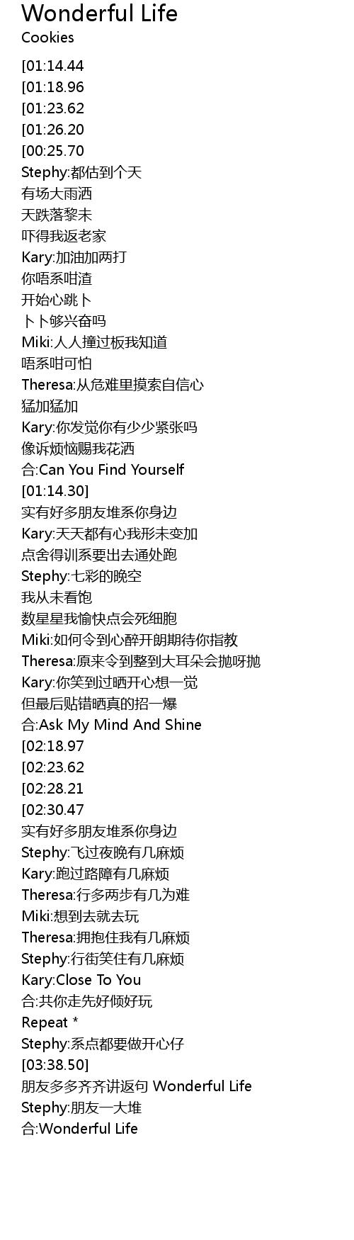 | [03:20.48][01:14.44][00:10.00] | Together Today Wonderful Life |