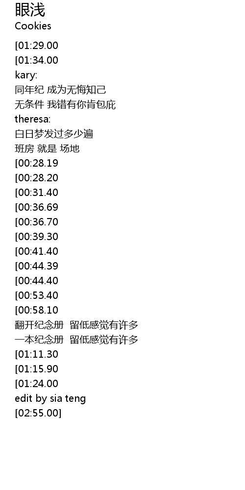| [02:40.00][01:29.00][00:03.00] | cookies - 眼浅 |