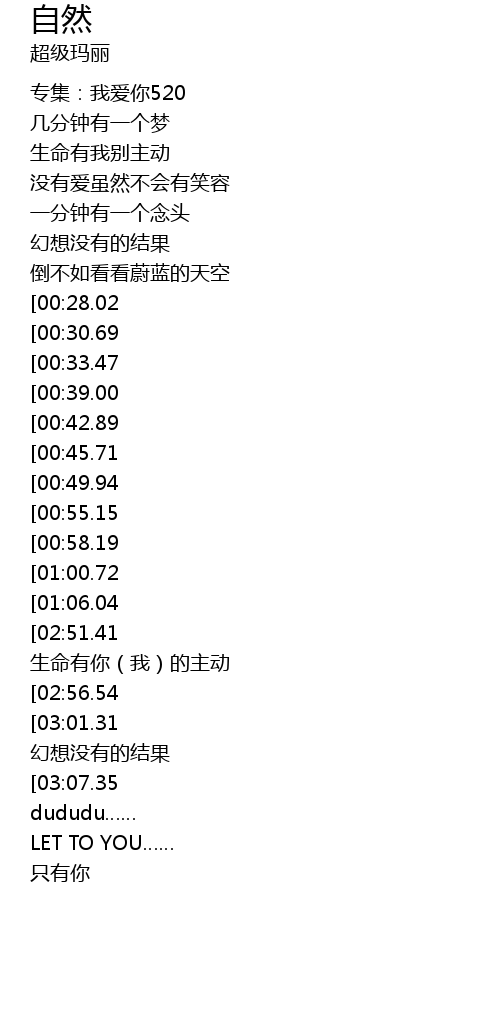 | [03:13.17][02:51.41][02:28.95][01:11.80] | 一分钟有一个梦 生命有你(我)的主动 |