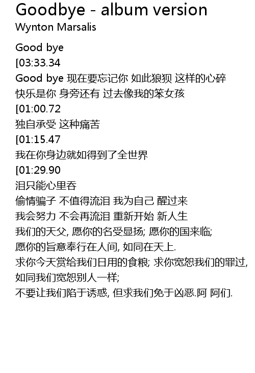 | [03:46.95] | 求你今天赏给我们日用的食粮; 求你宽恕我们的罪过, 如同我们宽恕别人一样; |