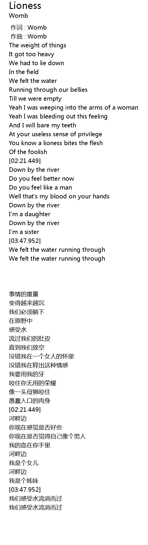 | [01:51.449] | You know a lioness bites the flesh |