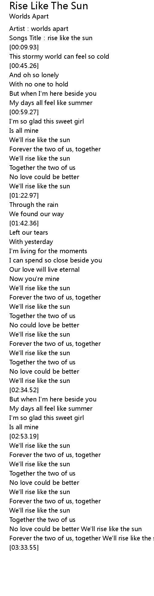 | [03:21.44] | No love could be better We'll rise like the sun |