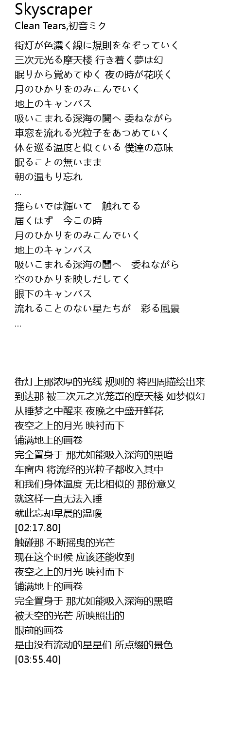 | [00:49.50] | 三次元光る摩天楼 行き着く夢は幻 |