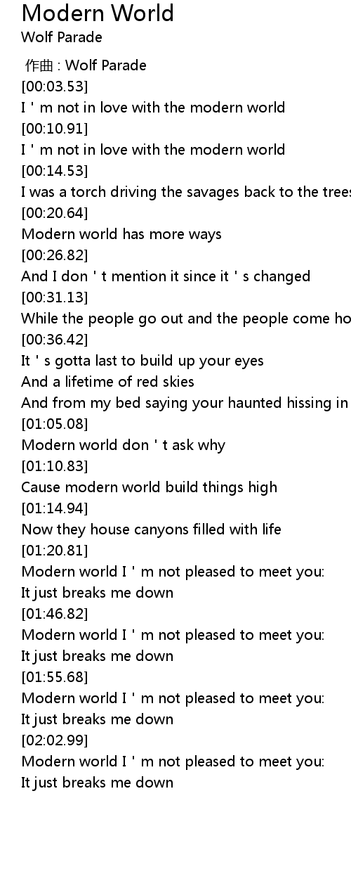 | [01:56.74] | Modern world I'm not pleased to meet you: |