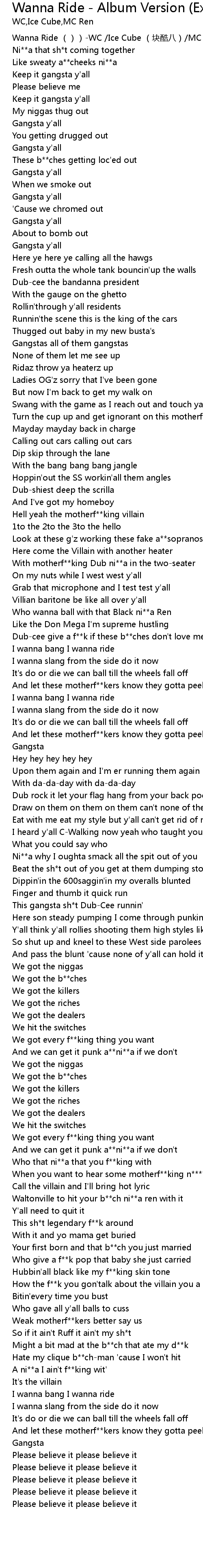 | [00:00.00] | Wanna Ride WC Ice Cube kuai ku ba MC Ren |