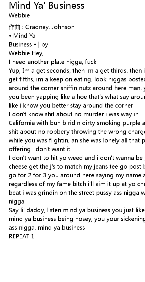 | Say lil daddy, listen mind ya business you just like one of these lil bitches, mind ya business being nosey, you your sickening, mind ya business ole police ass nigga, mind ya business | |