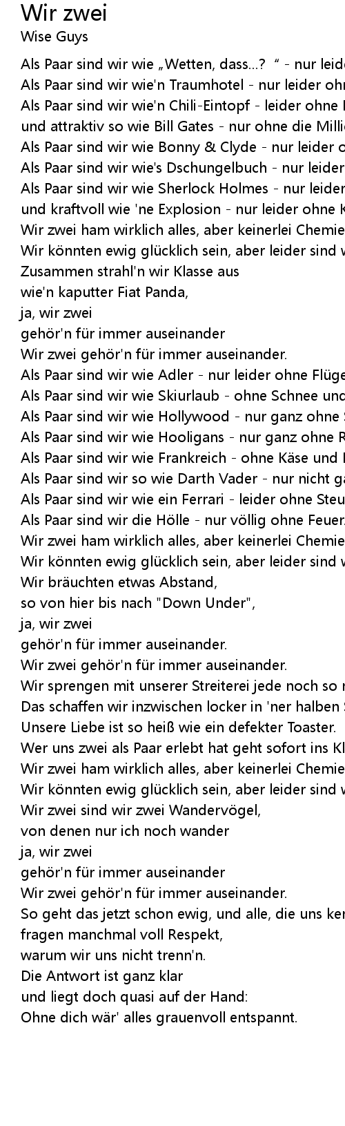 | Wir zwei geh r' n fü r immer auseinander. | |