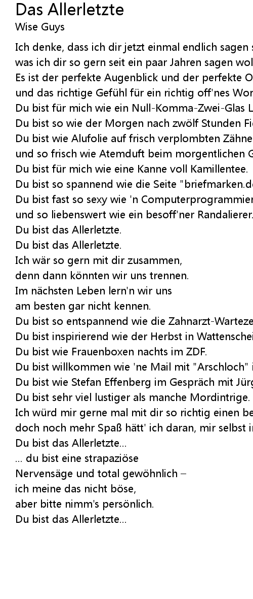 | Du bist willkommen wie ' ne Mail mit " Arschloch" im Betreff. | |