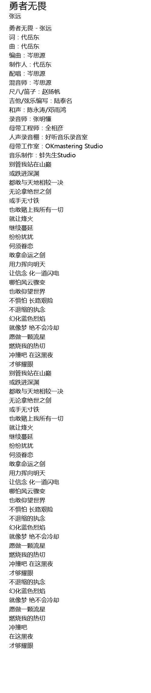 | [00:00.00] | 勇者无畏 - 张远 |