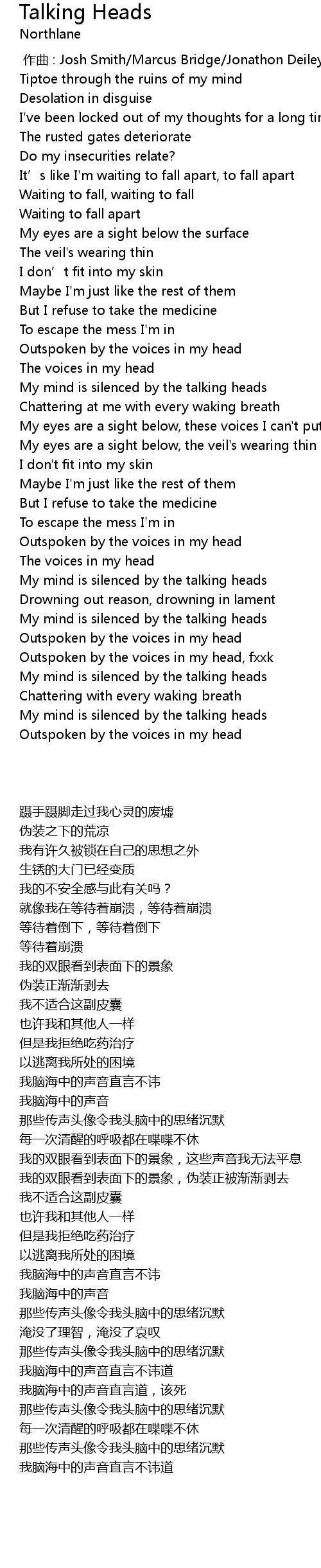 | [02:46.62] | My mind is silenced by the talking heads |