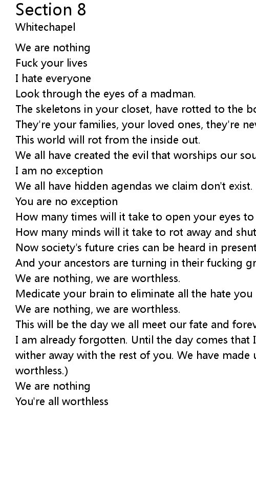 This will be the day we all meet our fate and forever decay. (I am already dead, I am already forgotten. Until the day comes that I am proven wrong, I will wither away with the rest of you. We have made us this way. We have become worthless.) |