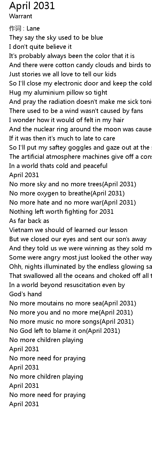 | No more music no more songs April 2031 | |