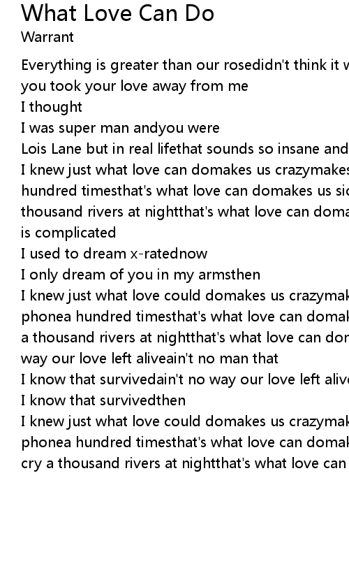 I knew just what love could domakes us crazymakes us flymakes you call your phonea hundred timesthat's what love can domakes us sickmakes me sighmakes us cry a thousand rivers at nightthat's what love can do |
