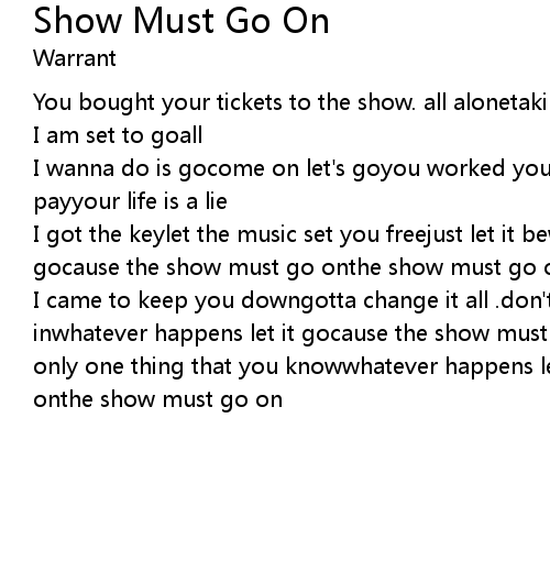 I came to keep you downgotta change it all .don't you ever let it indon't let it inwhatever happens let it gocause the show must go onthe show must go onthere is only one thing that you knowwhatever happens let it gocause the show must go onthe show must go on |