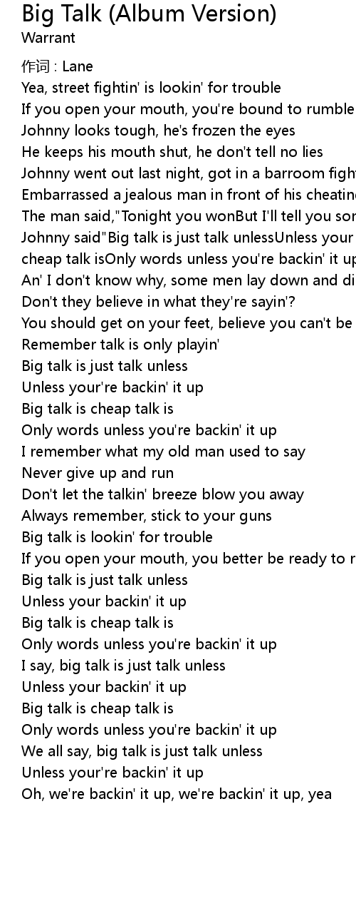 | Johnny said"Big talk is just talk unlessUnless your backin' it upBig talk is cheap talk isOnly words unless you're backin' it up" | |