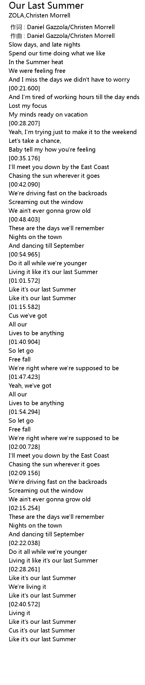 | [02:38.181] | Like it' s our last Summer |