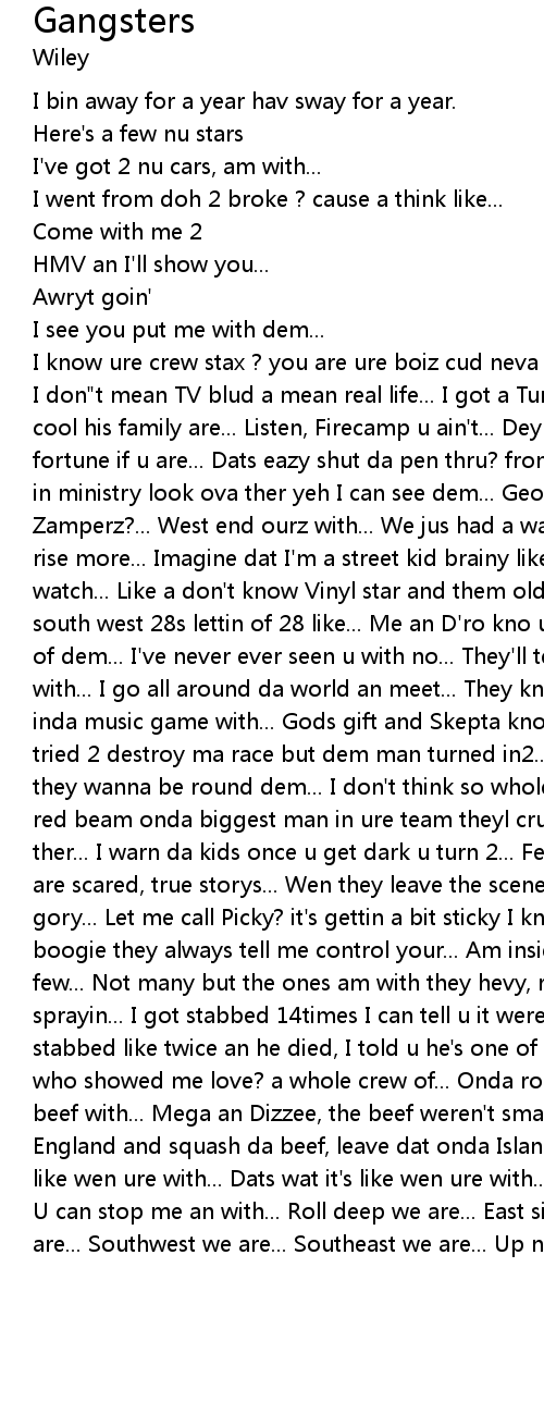 I don"t mean TV blud a mean real life... I got a Turkish bredrin from skool wer cool his family are... Listen, Firecamp u ain't... Dey say how can u make a fortune if u are... Dats eazy shut da pen thru? from here 2 north weezy... I wis in ministry look ova ther yeh I can see dem... George ure wife and she had Zamperz?... West end ourz with... We jus had a wave of nu... I think therz bin a rise more... Imagine dat I'm a street kid brainy like... Nik an dill? can relate watch... Like a don't know Vinyl star and them old time Brixton Wen I was a kid south west 28s lettin of 28 like... Me an D'ro kno u wer squeezin hard your one of dem... I've never ever seen u with no... They'll teach u a lesson don't mess with... I go all around da world an meet... They know ma name Wy cause a hustle inda music game with... Gods gift and Skepta kno wat am sayin The government tried 2 destroy ma race but dem man turned in2... U fink wen yanks cum 2 England they wanna be round dem... I don't think so whole security firm onda scene gotta red beam onda biggest man in ure team theyl crumble your dreams... Listen up ther... I warn da kids once u get dark u turn 2... Feel da dark force, police are scared, true storys... Wen they leave the scene, the whole scene looks gory... Let me call Picky? it's gettin a bit sticky I kno dem... I know Billy an boogie they always tell me control your... Am inside ryt now look around I see a few... Not many but the ones am with they hevy, ready... Wen the shells start sprayin... I got stabbed 14times I can tell u it weren't by... My uncle got stabbed like twice an he died, I told u he's one of dem... I was in Nottingham, who showed me love? a whole crew of... Onda road it's not a joke u don't want beef with... Mega an Dizzee, the beef weren't small some different... Back 2 England and squash da beef, leave dat onda Island, dead dat... Dats wat it's like wen ure with... Dats wat it's like wen ure with... Eski boi I roll with... U can stop me an with... Roll deep we are... East side we are... Northwest we are... Southwest we are... Southeast we are... Up north we are... |