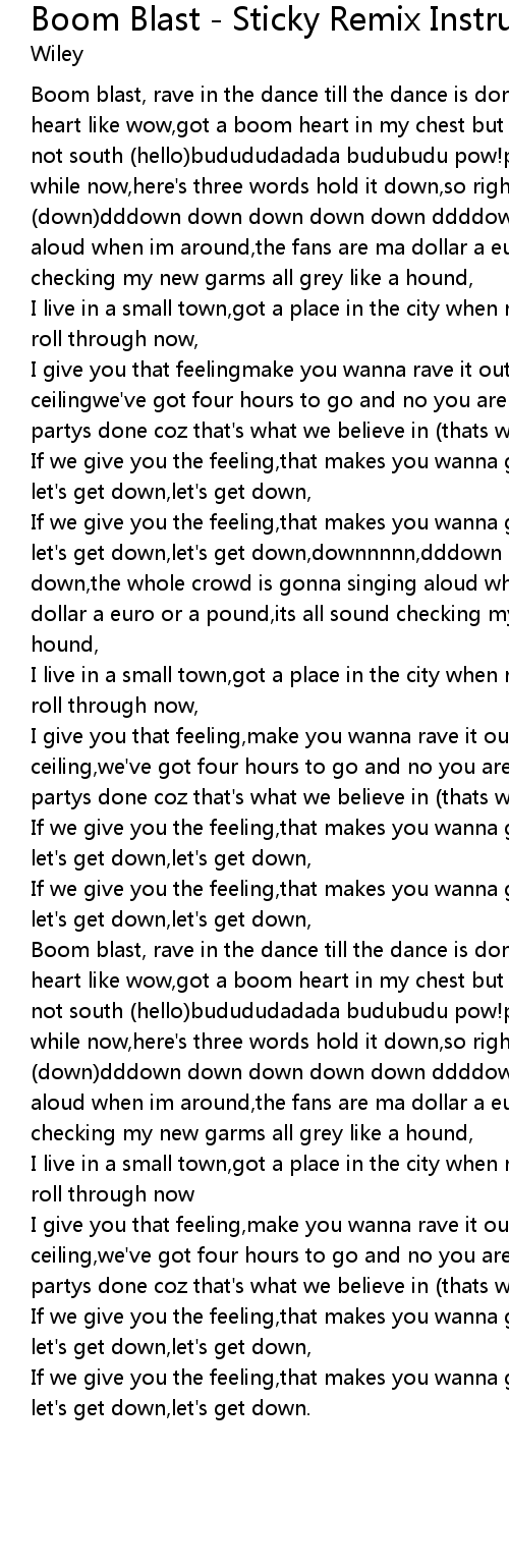 Boom blast, rave in the dance till the dance is done, ladies playing with my heart like wow,got a boom heart in my chest but how,when i flow cold north pole not south (hello)budududadada budubudu pow!peace love in my heart it's been a while now,here's three words hold it down,so right now i am gonna hold downnnnn (down)dddown down down down down ddddown down,the whole crowd is gonna singing aloud when im around,the fans are ma dollar a euro or a pound,its all sound checking my new garms all grey like a hound, |