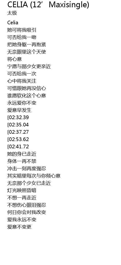 | [02:46.04][02:32.39][01:38.64][00:47.45] | CE CE CELIA |