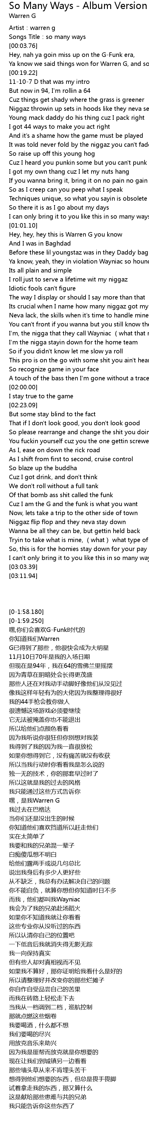 | [01:21.70] | Hey, hey, hey this is Warren G you know |