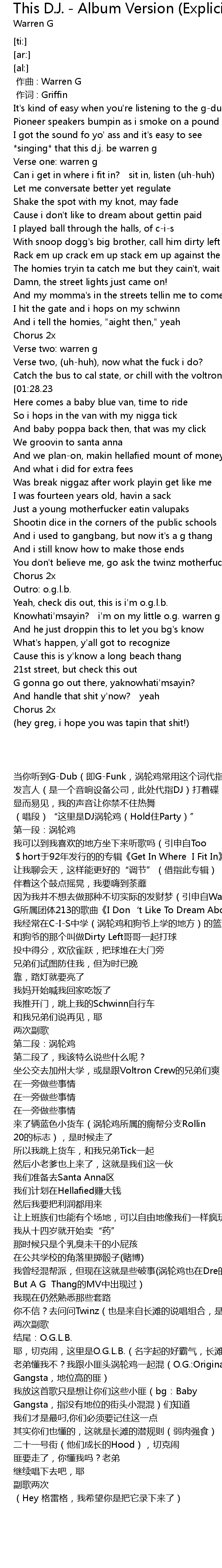 | [00:27.95] | *singing* that this d.j. be warren g |