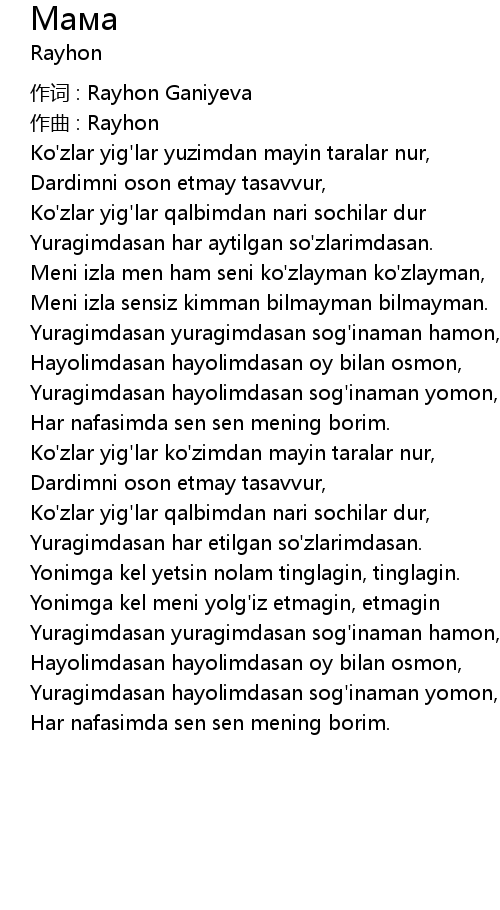 | 作词 : Rayhon Ganiyeva | |