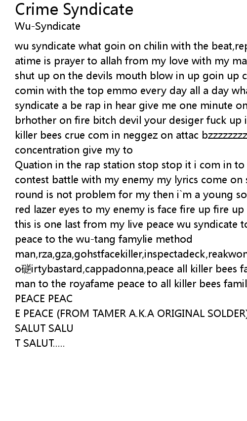 | wu syndicate what goin on chilin with the beat,represent killer bees song all atime is prayer to allah from my love with my main check this gun to my enemy shut up on the devils mouth blow in up goin up check my ryhmes check my lyrics comin with the top emmo every day all a day what, this is the beat from the wu syndicate a be rap in hear give me one minute on a mike mikrophone com in brhother on fire bitch devil your desiger fuck up i chillim at come my back we killer bees crue com in neggez on attac bzzzzzzzz bring in at on this nation concentration give my to | |