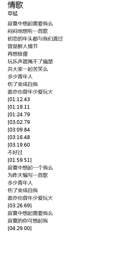 | [03:49.57][03:02.79][01:35.01] | 谁了解今天虽不开心都唱情歌 |
