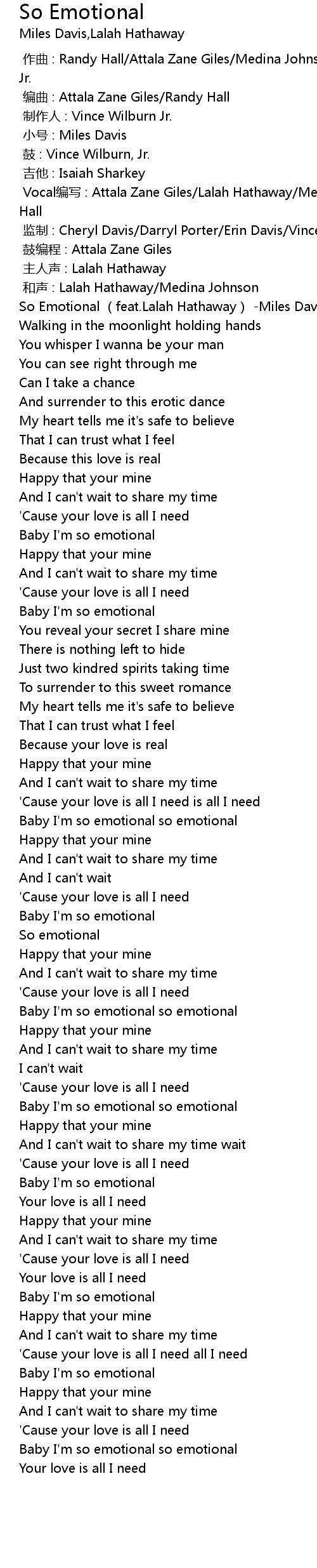 | [00:00.338] | So Emotional feat. Lalah Hathaway Miles Davis Lalah Hathaway |