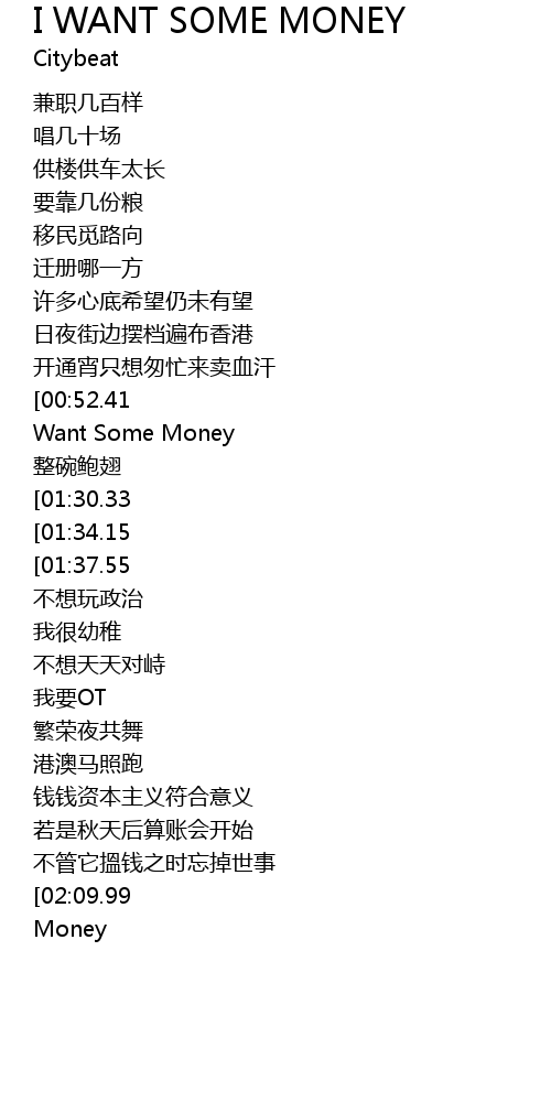 | [00:48.72][00:52.41][00:55.91][00:59.52][01:24.65][01:28.15][01:31.81][01:35.40][02:07.55][02:11.13][02:14.65][02:18.30][02:22.75][02:25.49][02:32.66] | I Want Some Money |