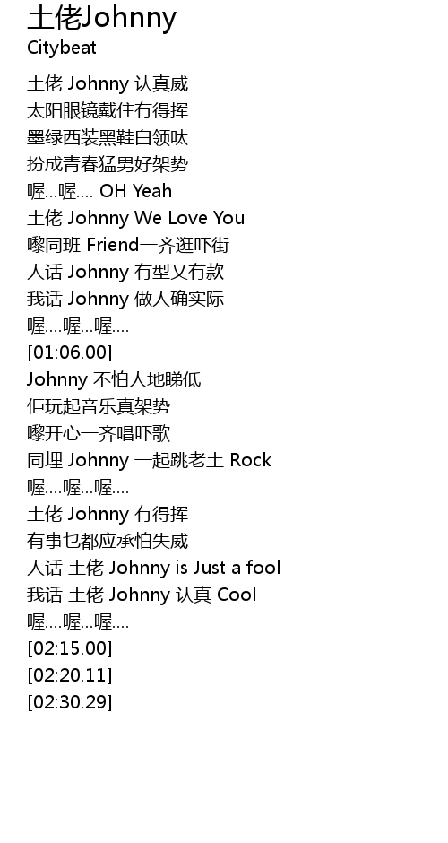 | [02:00.04] | 我话 土佬 Johnny 认真 Cool |