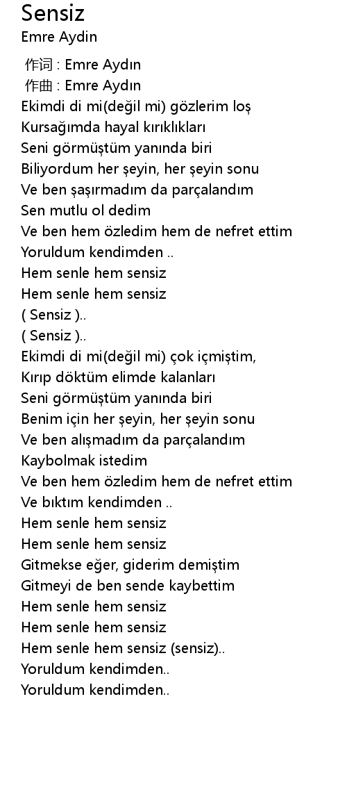 | [03:14.51] | Hem senle hem sensiz (sensiz).. |